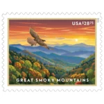 The new Priority Mail Express? stamp celebrates the beauty of the Great Smoky Mountains. The Smokies are home to extensive national lands and a vast array of native plants and animals. The stamp art captures an iconic mountain scene located near Newfound Gap between Gatlinburg, Tennessee, and Cherokee, North Carolina. In the foreground, a red-tailed hawk flies over the landscape.