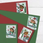 Whimsical elves bring smiles to the holidays with four new se tenant Stamps from the U.S. Postal Service. The stamp art features an original digital illustration of four elves preparing treats and toys for holiday gift giving.