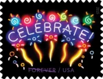 The U.S. Postal Service issued the “Celebrate!” stamp in 2015 to commemorate joyous occasions, drawing inspiration from the vibrant imagery at the Museum of Neon Art in Los Angeles.