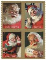 The sheet features a Haddon Sundblom painting, originally published in a 1963 Coca-Cola ad.? It’s an iconic scene of Santa visiting a home on Christmas Eve.? It includes one semi-jumbo version of one of the four special-sized Stamps included in the Sparkling Holidays set.