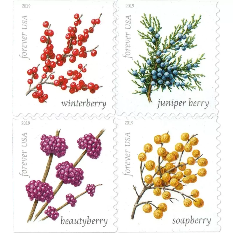 The stamp art features highly detailed botanical portraits of each plant that highlight the bold colors and rich textures of their berries. Artist Steve Buchanan worked with Art Director Antonio Alcal?? to create these four new Stamps.